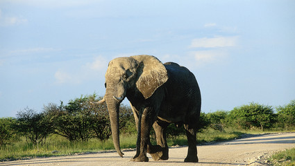 A wild giraffe crosses an African road ahead of a safari vehicle