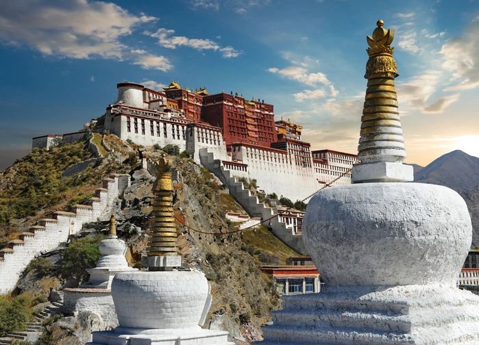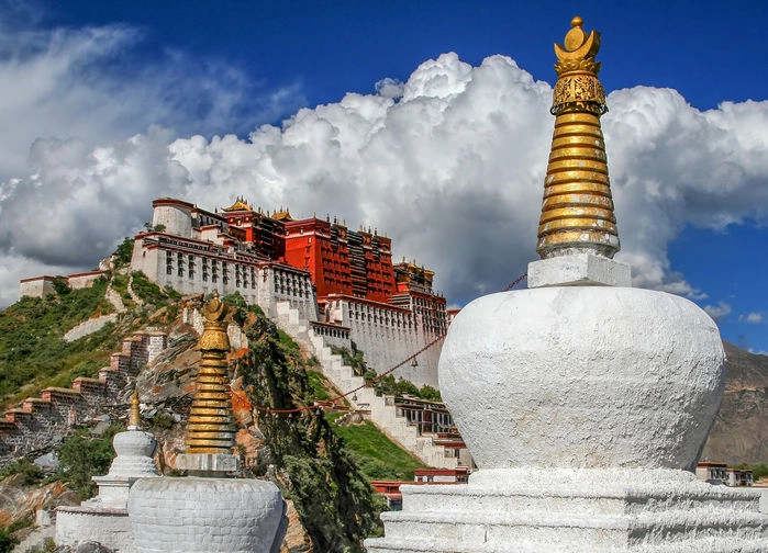 Vi åker till det imponerande Potala-palatset, byggt på Marpori, även kallat "Röda berget". Det syns från alla håll och har varit både fästning och kloster. Namnet betyder egentligen "En man vars visdom är lika djup som oceanen" (dalai = ocean och lama = vis man). Potalapalatset uppfördes på 1600-talet och är uppdelat i röda och vita byggnader i 13 våningar med över 1 000 rum. Vid åsynen av detta byggnadsverk slås man av insikten att det aldrig mer kommer att uppföras ett palats som detta. Under rundvandringen är det synnerligen nyckfullt vilka delar av Potala som är öppna för besök. Oftast ges tillträde till terrassvåningarna med Dalai lamas privata kvarter. Den religiösa, röda palatsdelen är alltid öppen för besökare och hit vallfärdar pilgrimer från hela Tibet. Här finns en gigantisk, juvelbehängd buddha, tidigare Dalai lamas gravar liksom fängslande muralmålningar som berättar om buddhistiskt och tibetanskt vardagsliv genom seklerna.