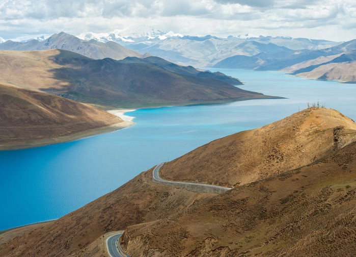 Idag är Yamdrok-sjön vår första anhalt. När vi närmar oss Kamba La-passet på 4980 meters höjd, sveps vi med av dess dramatiska skönhet. Yamdrok Tso sträcker ut sig framför oss som en dröm, en symbol för tibetanska landskapets föränderliga karaktär och skönhet täcker en yta på cirka 638 kvadratkilometer. Dess exakta djup varierar, men det beräknas vara mellan 20 och 60 meter på olika platser. Sjön är känd för sitt kristallklara vatten och dess skiftande nyanser av turkos och smaragdgrönt