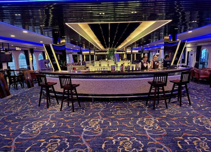 Senare på kvällen går vi ombord på vår fina flodkryssare på Yangtze-floden som slingrar sig genom Kina som en drake.